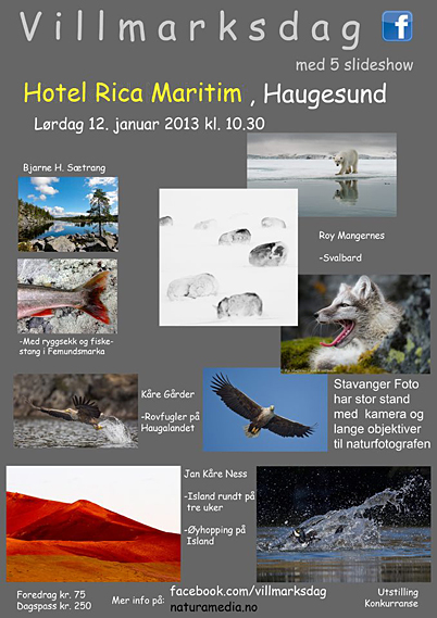 5-6 timer innendørs på en flott, solfylt vinterdag ble det i dag. Tror ikke de som møtte opp på "Villmarksdag" på Hotel Rica Maritim i Haugesund i dag angret. Naturfotografi i verdenstoppen(!) innledet nemlig dagen der Roy Mangersnes viste oss sine bilder fra Svalbard. Fantastiske bilder av høyeste kvalitet! Artig også å se bildene hans fra plasser jeg selv var på tur våren -93 der oppe.