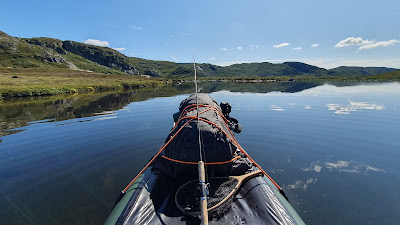 Jeg oppdager at denne bæreetappen har gått enklere i praksis enn i planverket mitt. Båten kan nemlig enkelt slepes over de faste myrene, gress- og lyngpartiene som det er mye av her (jeg og turkompis Frank testet dette ut på Hardangervidda for noen år siden med stor suksess!). Det er kun over stein og bergpartier jeg må løfte båten over. Packraften min er er av den solide sorten og i ettertid kan jeg ikke se spor av dette. All hyllest til Kipara!
